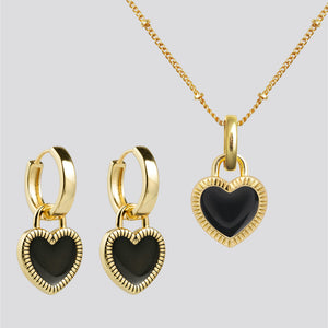 Amara's Black Heart set captures the 2024 trend with sophistication. This dual-sided, gold-plated set gives you the freedom to showcase your style, your way. Whether it's a casual day or a special evening, these pieces add a vintage golden touch to your look.