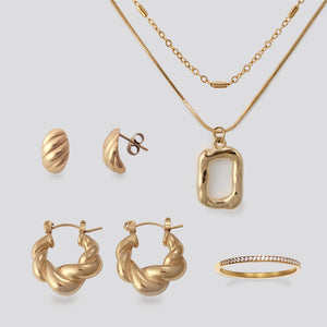 Make a bold statement with this striking gold-plated ensemble. From a glamorous night out to a special event, the layered necklaces and standout hoops paired with our chic rings will turn heads and spotlight your style.